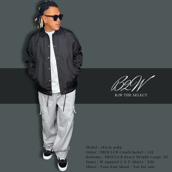 人気急上昇中のプロクラブからクラッシックスタイルのコーチジャケットの入荷です。 フロントの 6 つのスナップボタン留め、リブ仕様の袖口、サイド ポケット 2 つはもちろん、内ポケット1つが付いています。 ゆったりとしたフィット感で、風や寒さから身を守りバイクなどにもおすすめです。少量入荷ですので、お早めにどうぞ!!ラッパーのeydenがPVで着用しており人気なPROCLUB。おすすめです!