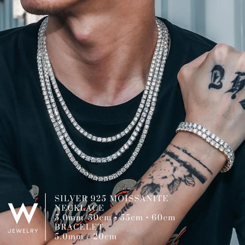 W Jewelryのモアサナイトテニスチェーンブレスレットは、シルバー925素材を使用し高輝度の美しさを誇るアイテムで手首に華やかさを添え、ストリートからヒップホップスタイルはもちろんドレスやキレイ目なスタイルまで幅広いシーンで活躍します。ユニセックスデザインのため、メンズ・レディース問わずお楽しみいただけます。ロジウムコーティングが施されており耐久性とデザイン性を両立しています。金属アレルギー対応なので、安心してご使用いただけるのも嬉しいポイントです。モアサナイトはダイヤモンドに匹敵する輝きを持ち特別な日の装いにもぴったりです。専用ブランドハードケースも付いておりギフトにもぴったりなブレスレットです!※レビューを書くお約束で持ち運び用のポーチもプレゼント!