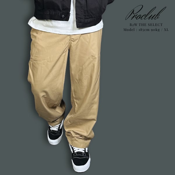フロントにワシットのプリーツがついており、シルエットも上品でフロントポケット、バックにウェルトポケット、クラシックな快適さとスタイルを実現するバギーレッグフィット。ドレスシューズとの組み合わせに最適で、最高の快適さとスタイルを実現。もちろんスニーカーでも右バックポケットの上にPROCLUBウーブンラベルがついていてシンプルながら履き心地も抜群でキレイ目なストリートスタイルにおすすめです。ラッパーのeydenがPVで着用しており人気なPROCLUB。おすすめです!