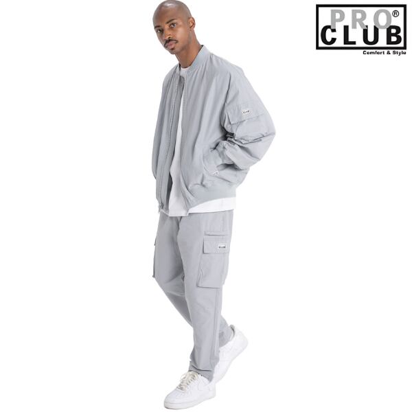 人気急上昇中のプロクラブからシンプルでセンスのいいボンバージャケットが入荷。 オーバーサイズフィットで身幅にゆとりを持たせたストリートらしいシルエットが特徴で軽量で通気性のあるコットンナイロン素材で光沢を抑えたマットな質感がシンプルながら大人っぽい印象です。軽量で通気性があり、中綿なしのライトアウター仕様のため、春・秋の羽織物として使い勝手がいいアイテムです。ヒップホップスタイルやLAストリートのラフなスタイルにおすすめな一着。ユニセックス対応で大きいサイズまで展開があります。