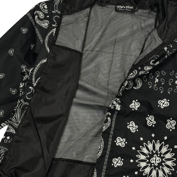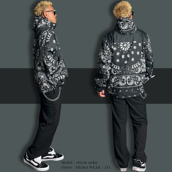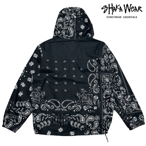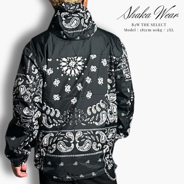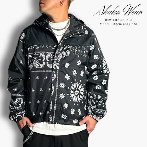 主に無地ウェアを展開しているLos Angeles発のストリートブランドSHAKA WEAR (シャカウェア)。 PRO CLUBのようなブランドでヘビーウェイトのスウェットやTシャツが日本でも人気上昇中の注目ブランドからブラックカラーにペイズリー柄のナイロンジャケットが入荷。機能性も備えており、1年を通して長いシーズン使うことができる、持っていて損のない使い勝手の良いアイテムです。素材はしっかりとした質感のナイロンリップストップ地でペイズリー柄がオシャレ。両サイドにジッパーポケットを配し、裾のドローコードで調節可能、裏地はメッシュ地で着心地が良く、身幅がゆったりとしたワイドシルエットでストリート感のあるジャケットでアウトドアやスポーツにも最適です。